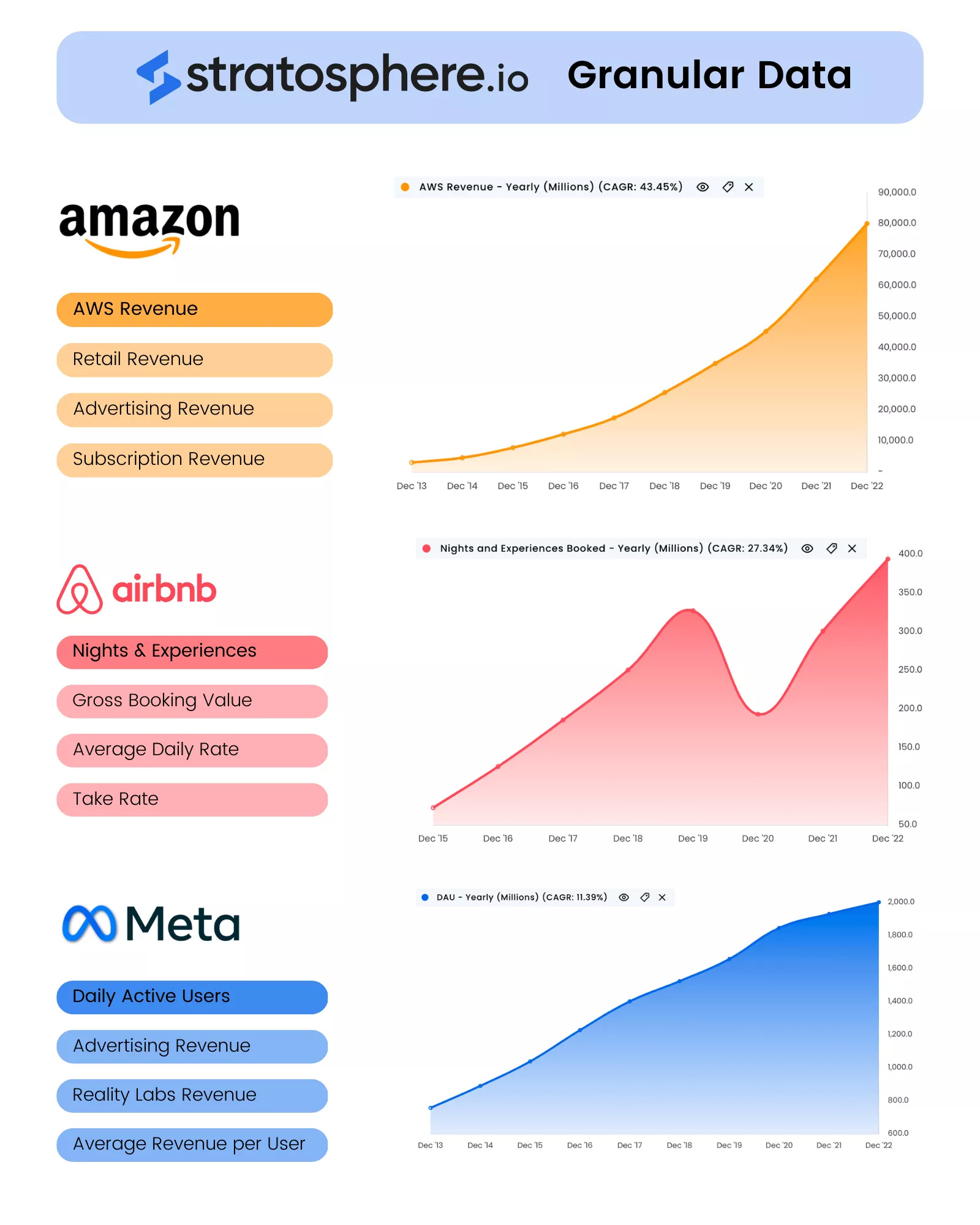 Stratosphere provides a platform allowing users to dive deep into a company's financials, visualize key data, and screen for new investment opportunities. Their Segment & KPI data provides investors with insights that go beyond standard financial reports and tools, distinguishing Stratosphere from others.
