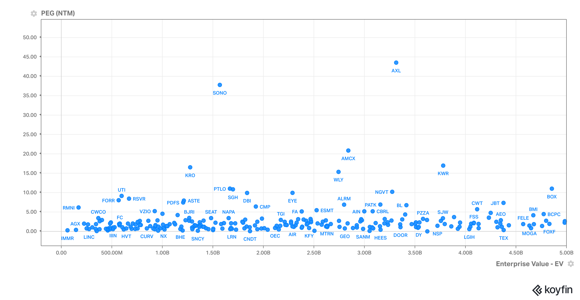For example, select the Russel 2000 index and plot Enterprise Value (EV) vs. Price/Earnings to Growth (PEG) ratio. This scatter plot provides a perspective that combines the total value of a company (including its debt and cash) with its earnings growth prospects.