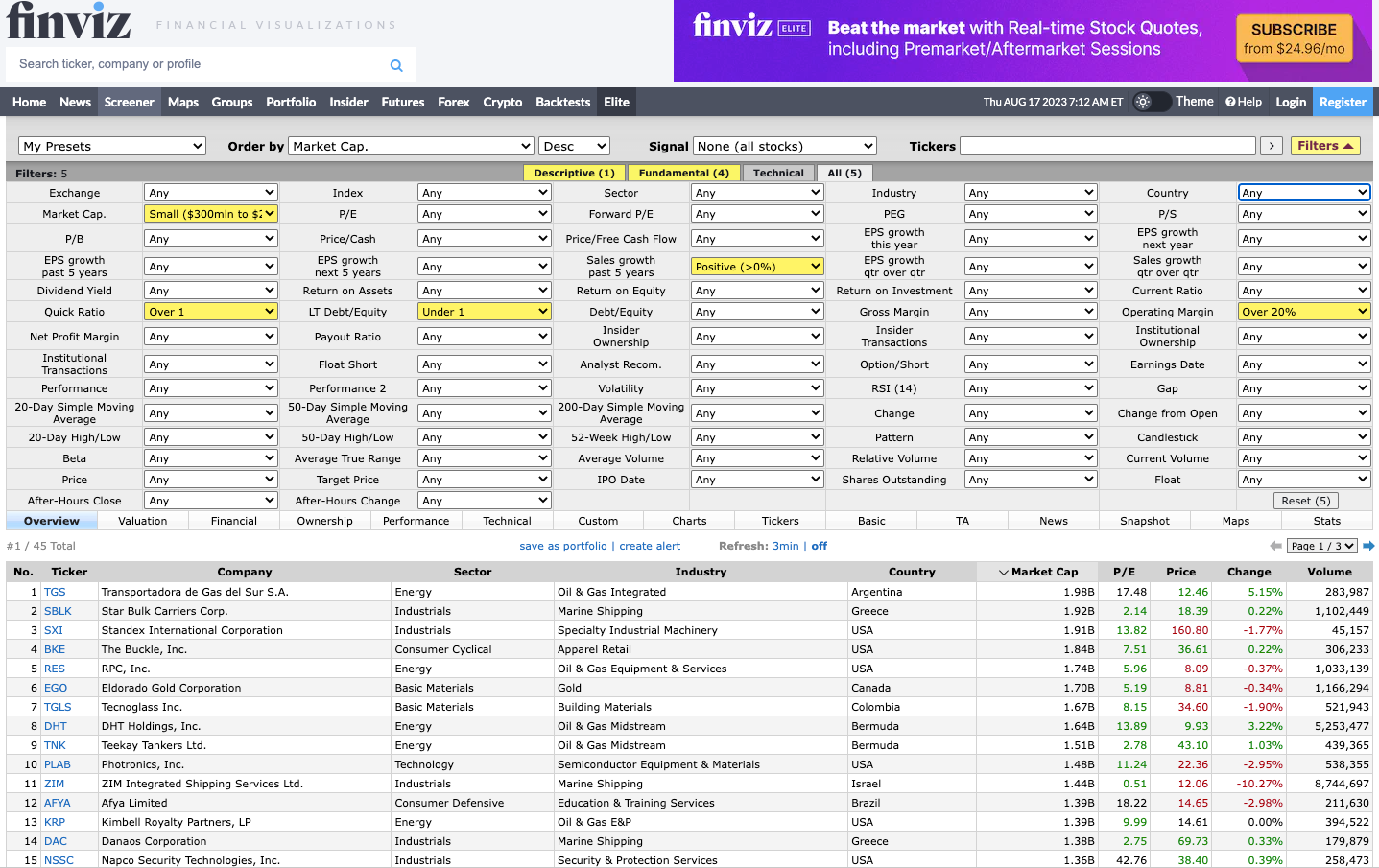 Build a quick small-cap quality screener using some profitability and efficiency metrics.