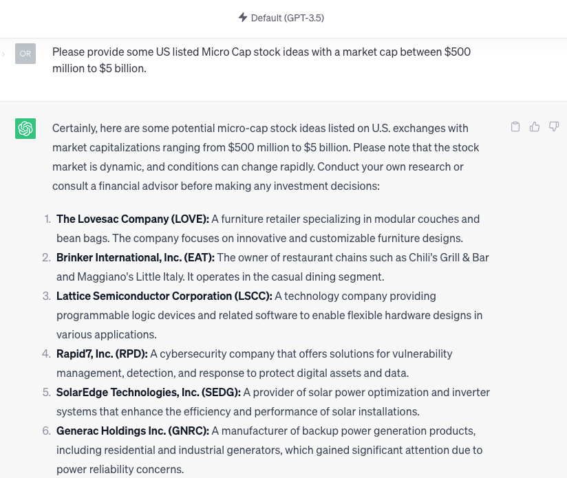 Feed ChatGPT with structured data on your company's financials, and receive a textual summary highlighting essential metrics, patterns, and insights. Alternatively, brainstorm some investment ideas like US-listed Micro-Caps (please keep in mind ChatGPT's knowledge cutoff date of September 2021).
