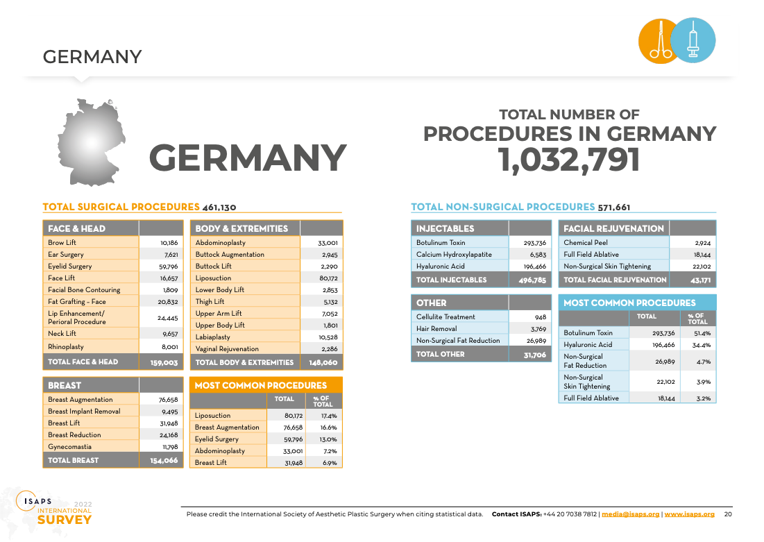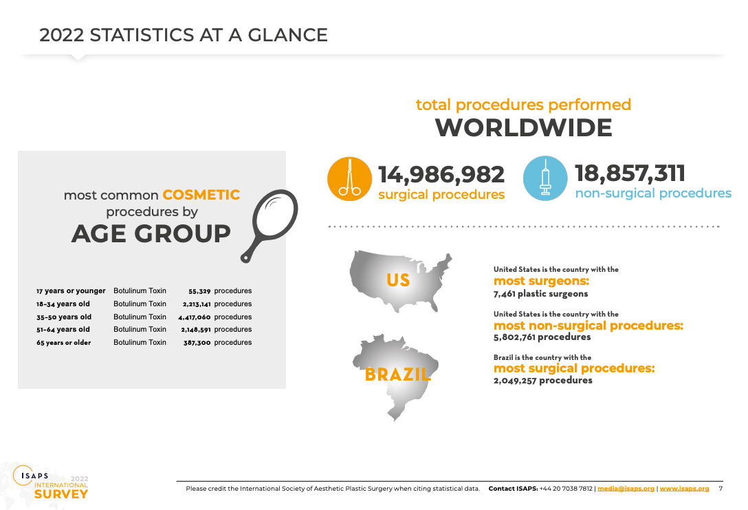 The latest 2022 survey by ISAPS (International Society of Aesthetic Plastic Surgery) shows an 11.2% overall increase in procedures performed by plastic surgeons in 2022, with more than 14.9 million surgical and 18.8 million non-surgical procedures performed worldwide.